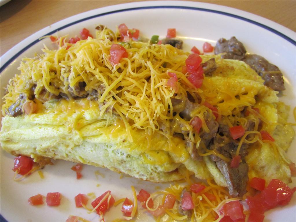 This is the ‘Big Steak Omelette’. Packed full of cheese and tender meat this omelette is more than it appears. They have kicked it up a notch and added pancake batter to the omelette base to make it bigger, fluffier and more delicious!