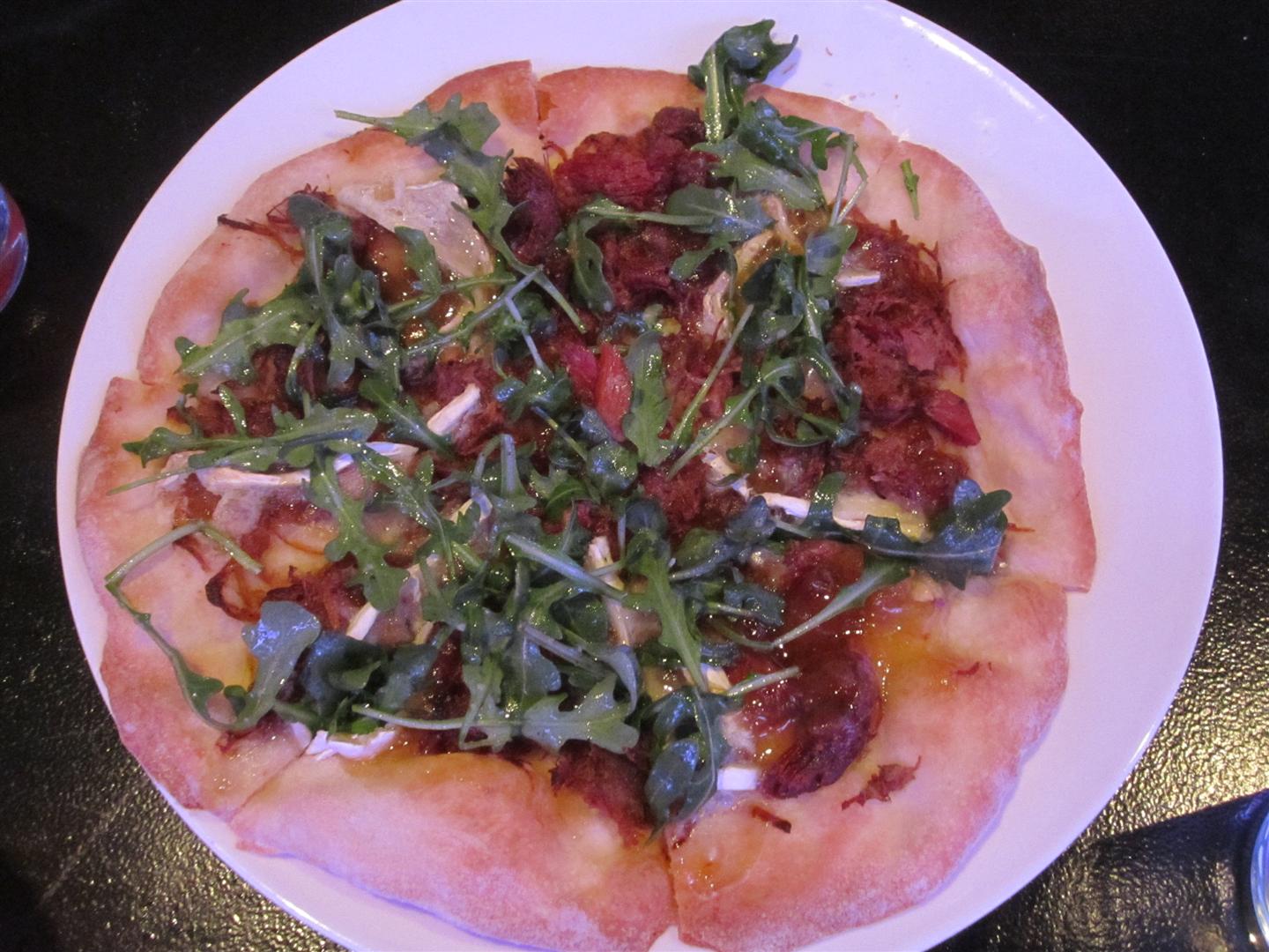 Duck Confit Pizza – with Brie, Arugula, Caramelized Onion and Nectarine Jam ($14)