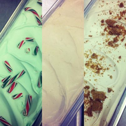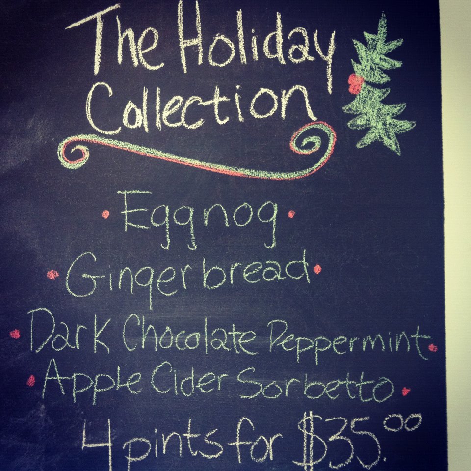 Eggnog, Gingerbread, Dark Chocolate Peppermint and Apple Cider Sorbetto.