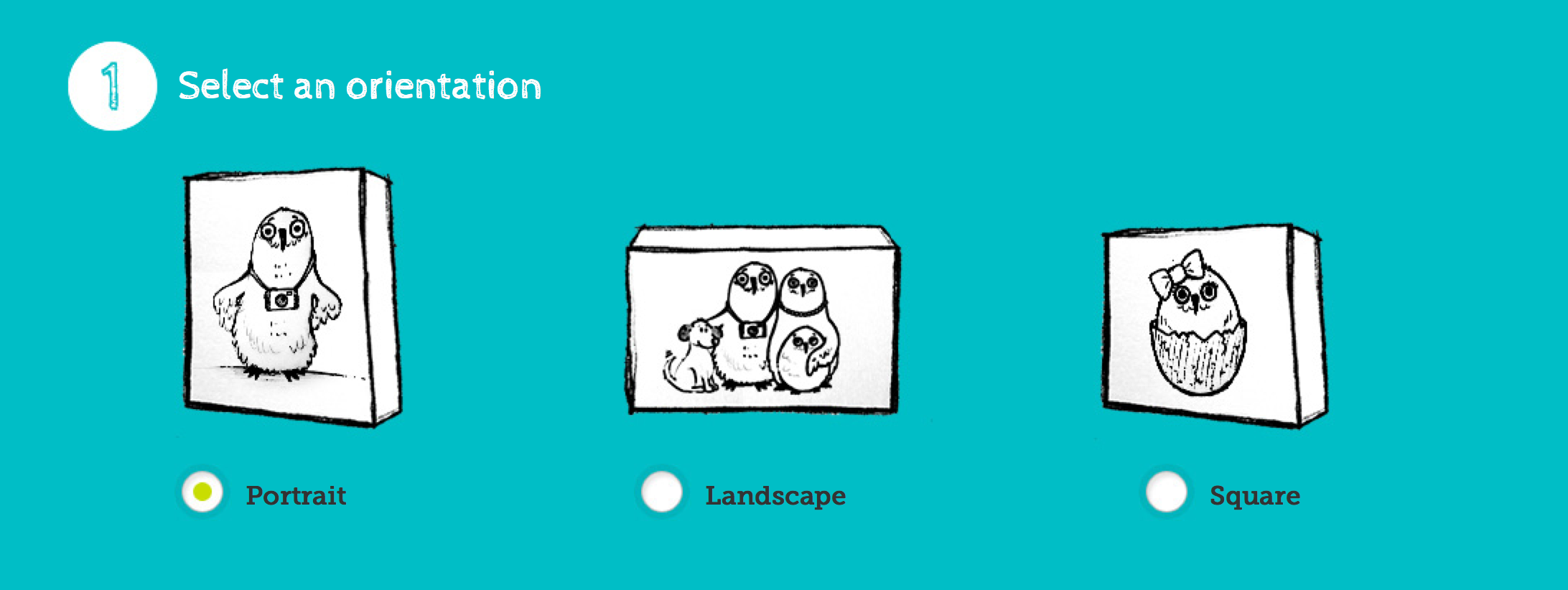 There are three orientations to choose from – Portrait, Landscape or Square. Each of these options come with a variety of sizing options, from on-your-desk-at-work to make-a-statement-over-the-fireplace sizes.