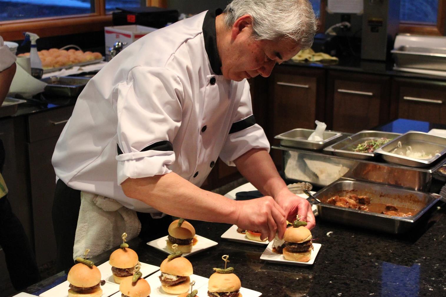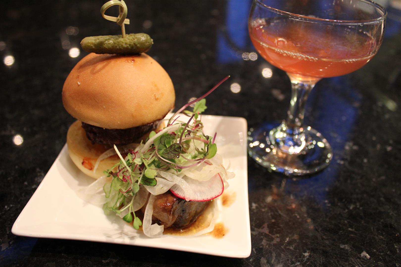 Azuridge’s own proud chef, Chef Yoshi, with Alberta Waygu Beef two ways: beef on a bun, with a side of tender short-rib. And for the compliments, the Ladybear Garnet with a spritz of Absynthe by the famed Stephen Phipps of National’s Bourbon Room. A simplistic look with complex ingredients.