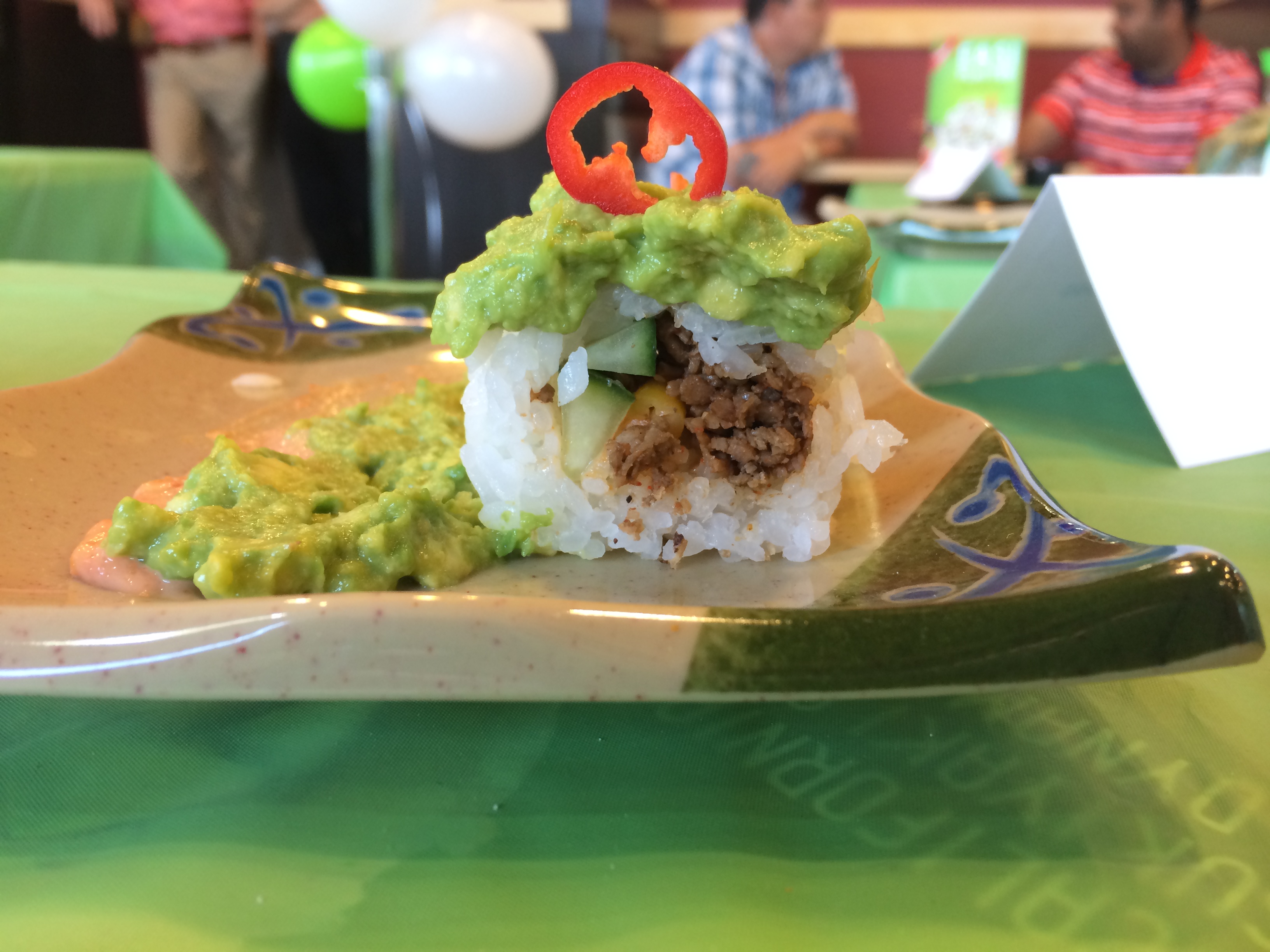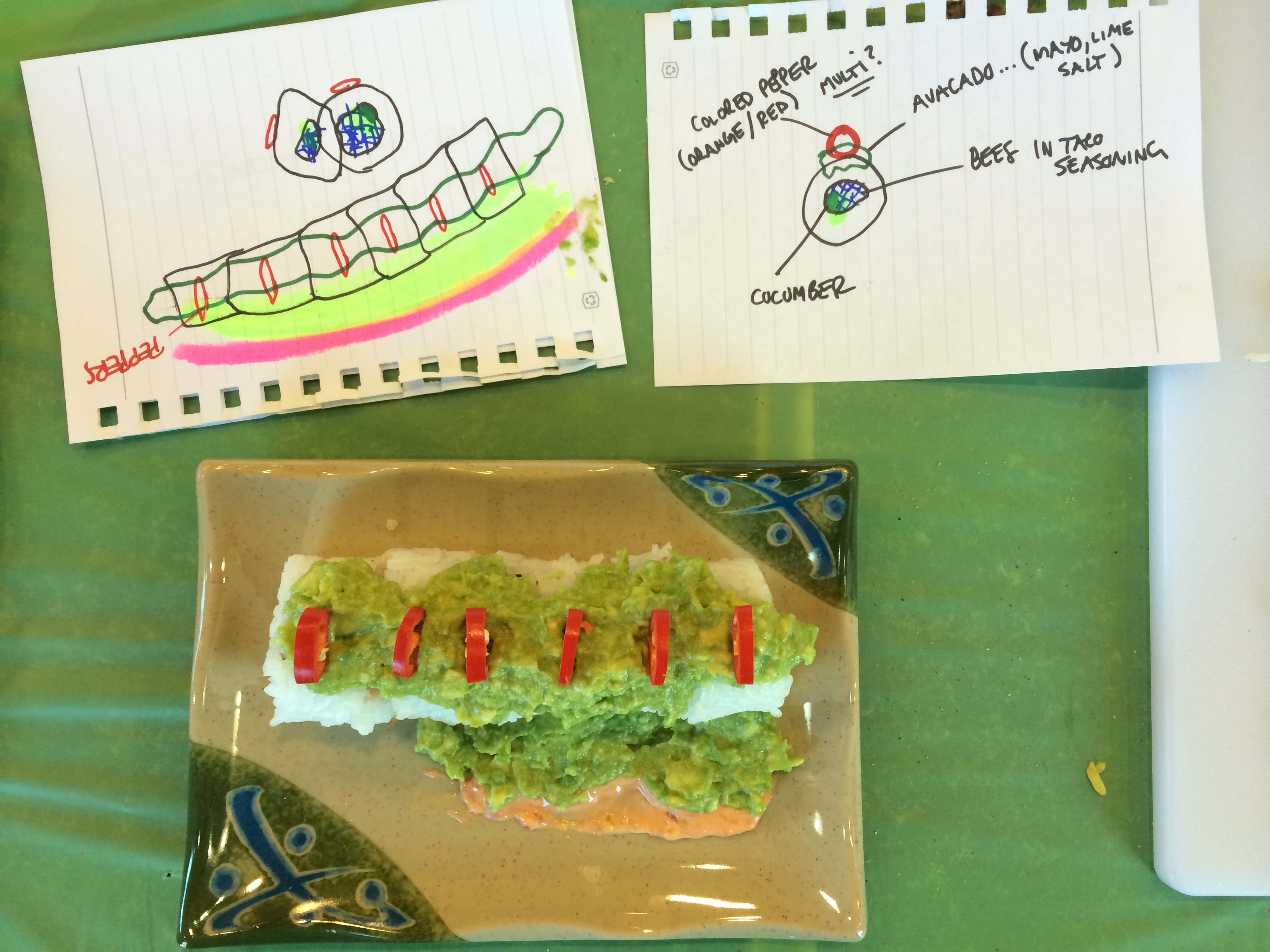 Oh boy, Time to roll! After adding some cucumber and a little spicy mayo on the rice, I rolled it successfully (!) and plated with some “guacamole” & peppers with 1 minute to spare.