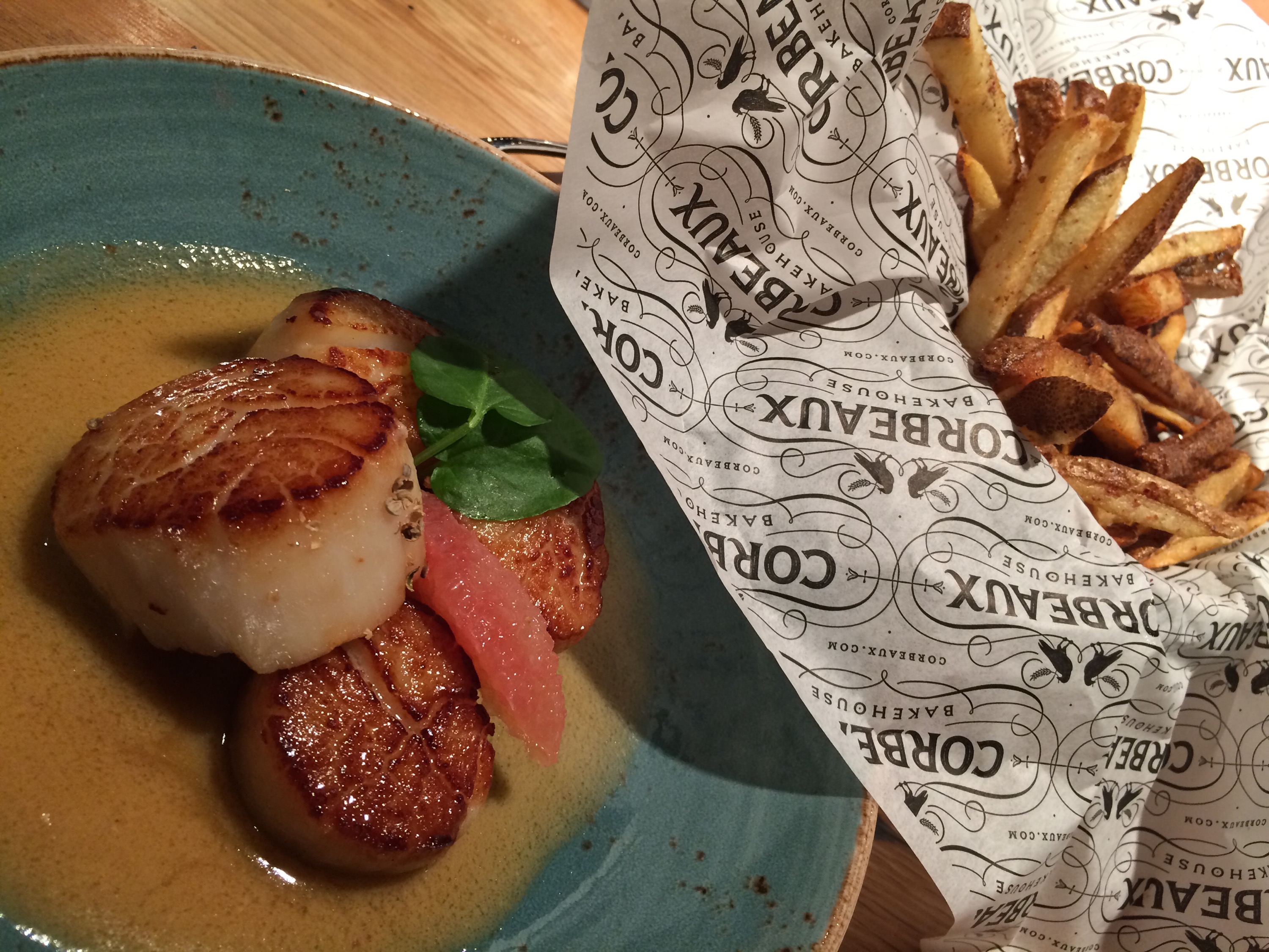 Then, it was a lite snack prior to lunch. Wine, fries and some of the most succulent scallops bathed in miso & grapefruit.