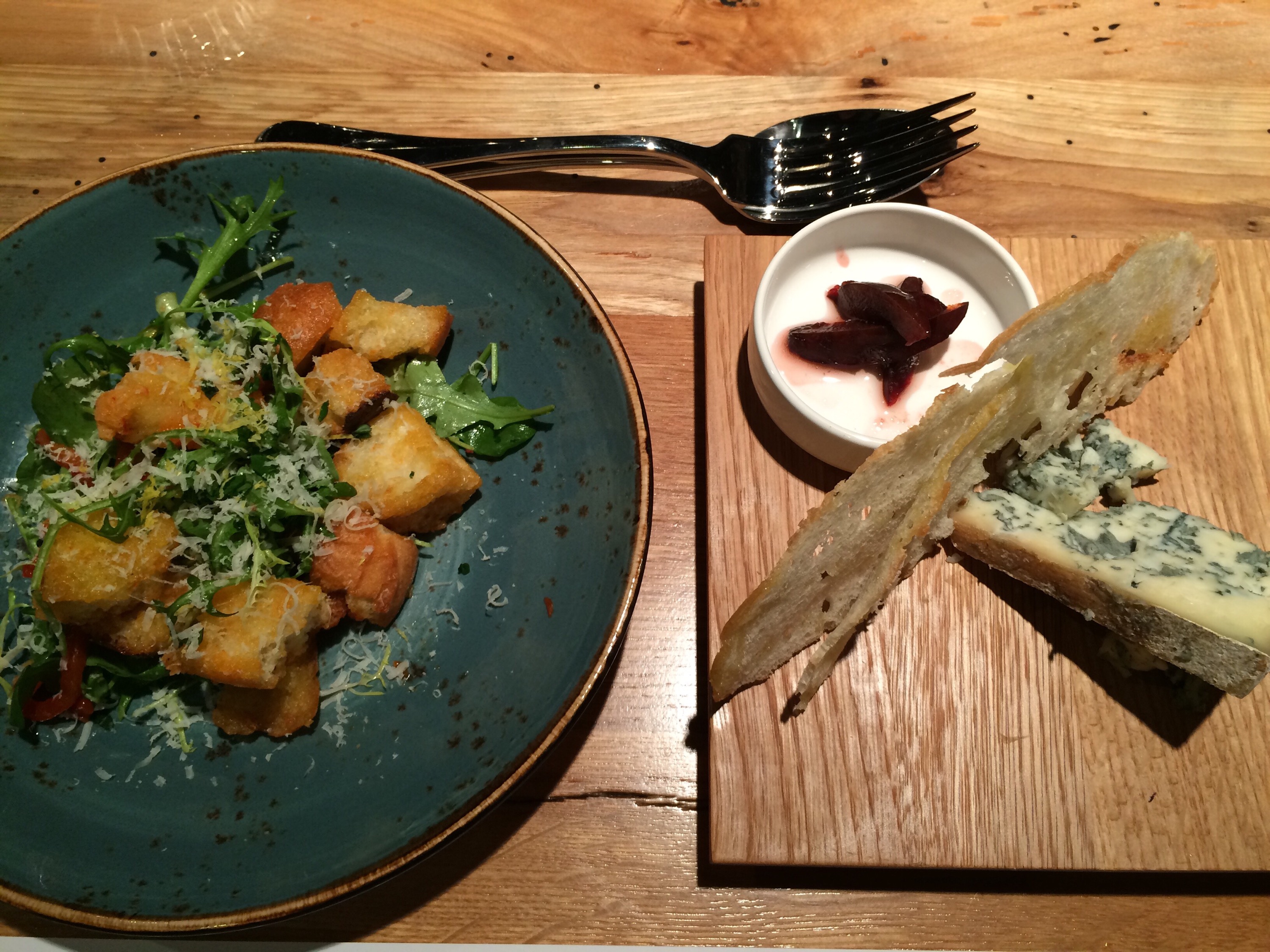 Just when I thought the menu couldn’t offer up any more options, out came a Warm Panzanella (bread salad with mixed greens & roasted tomatoes) and a generous wedge of Valdeon Blue cheese with port-washed prunes