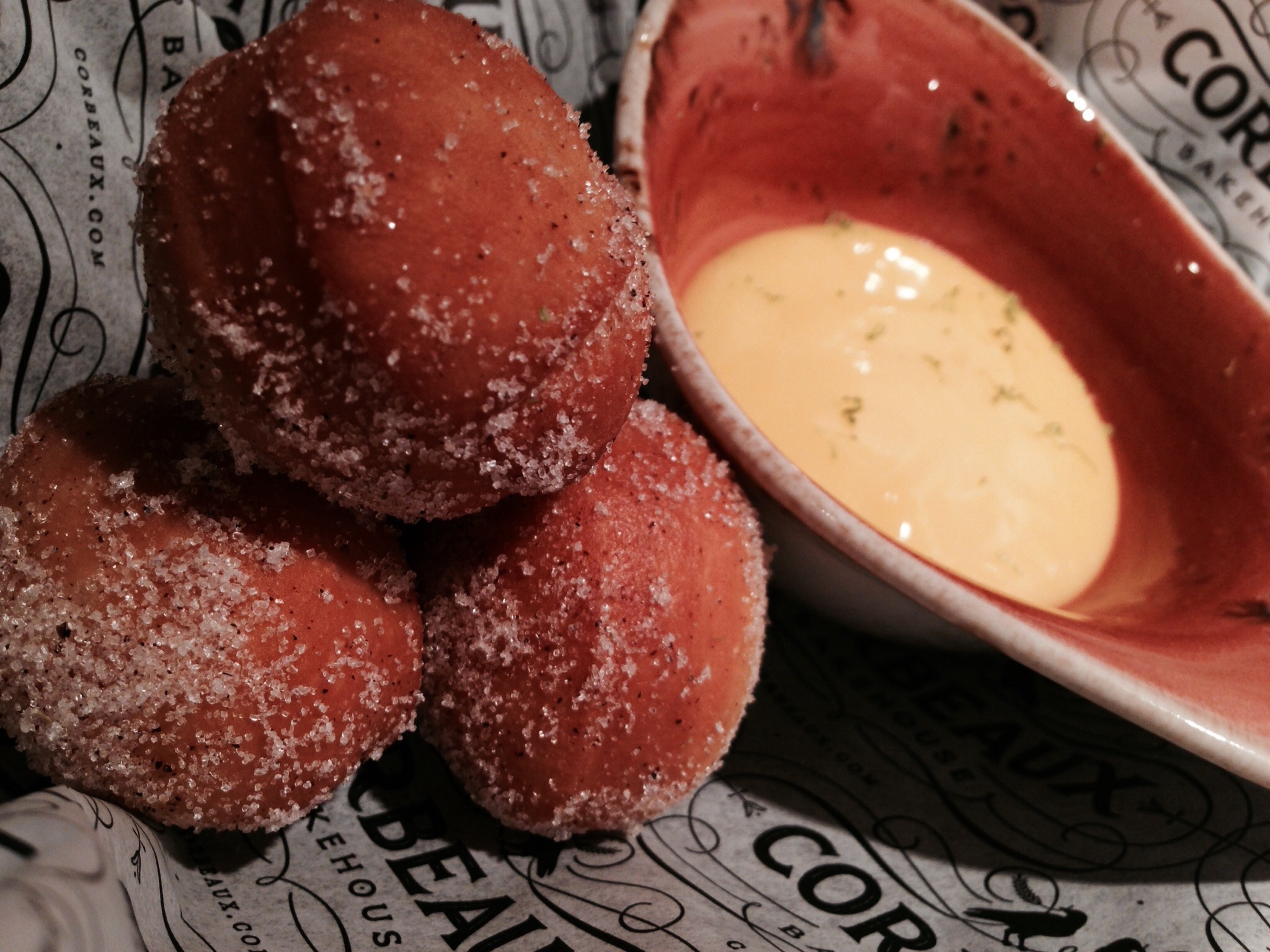 Warm mini doughnuts rolled in sugar with a luxurious sized portion of lemon curd… Opulence!