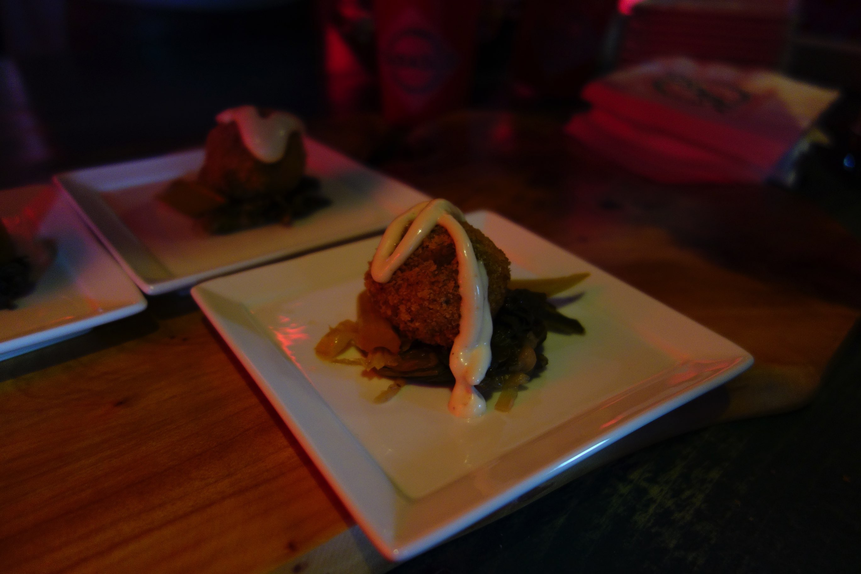 2. Scott Vivian’sBoudin Balls with TABASCO sauce, pickled celery, chilled collard greens and potlicker Aioli.