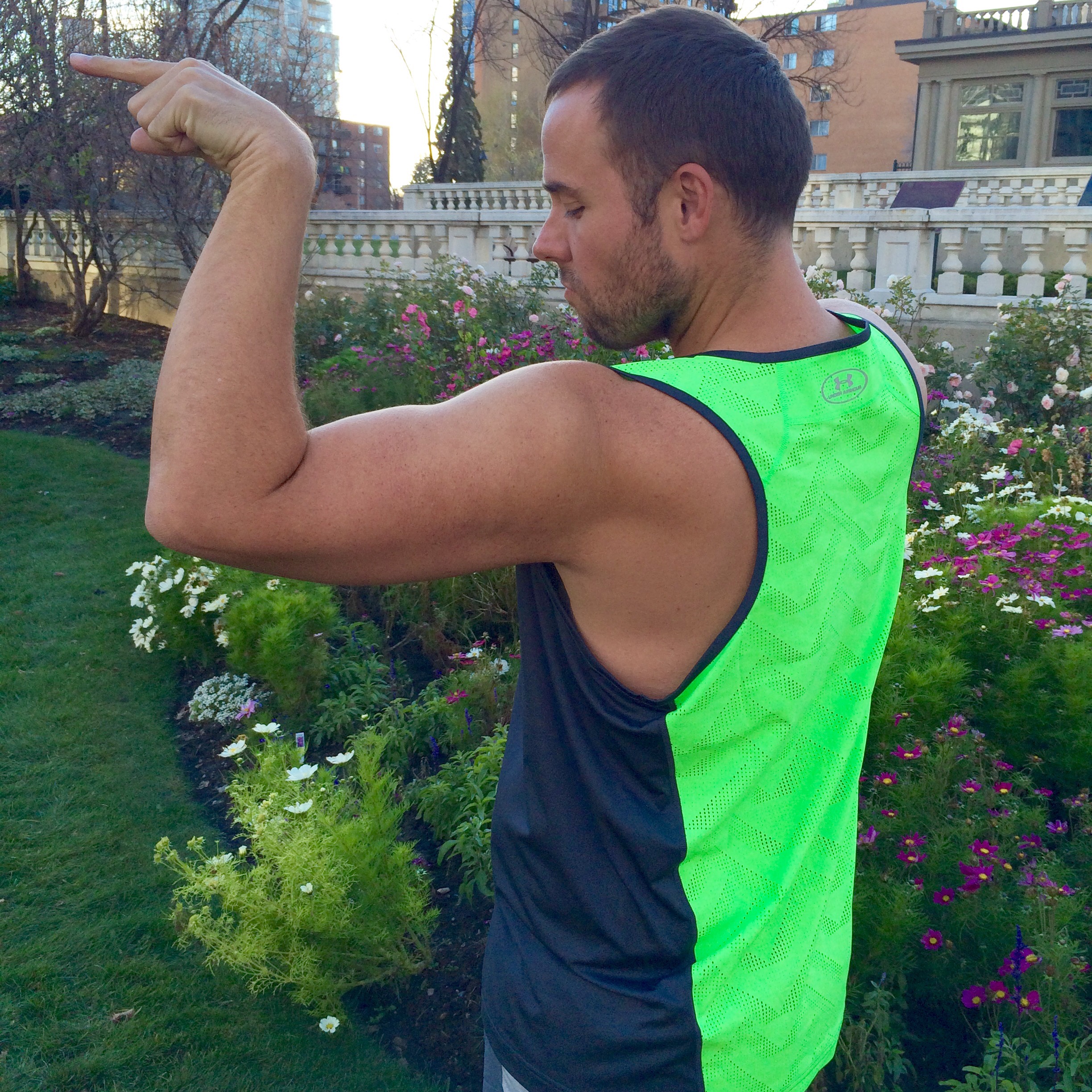 Sleeveless so I can keep an eye on my “This way to the beach” pipes and with its mesh back I’ll keep cool & dry. And with its neon color and reflective detailing, I’ll keep safe during a night run.
