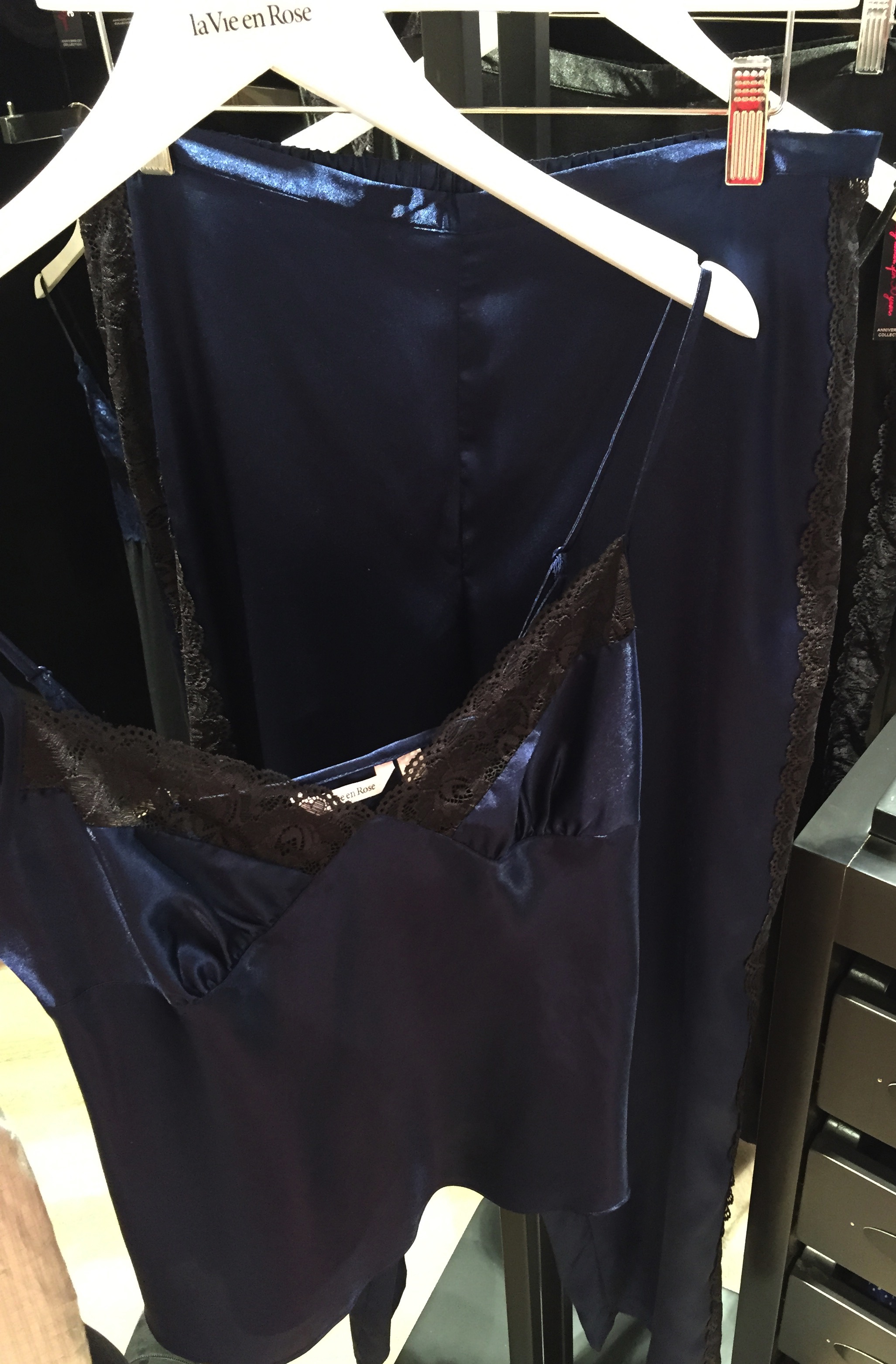 So soft, so silky. This lovely cami and pant set comes in this navy and black combo, or all black. I like to think of this set as the practical gal’s choice – all your important bits covered, but still an air of mystery.