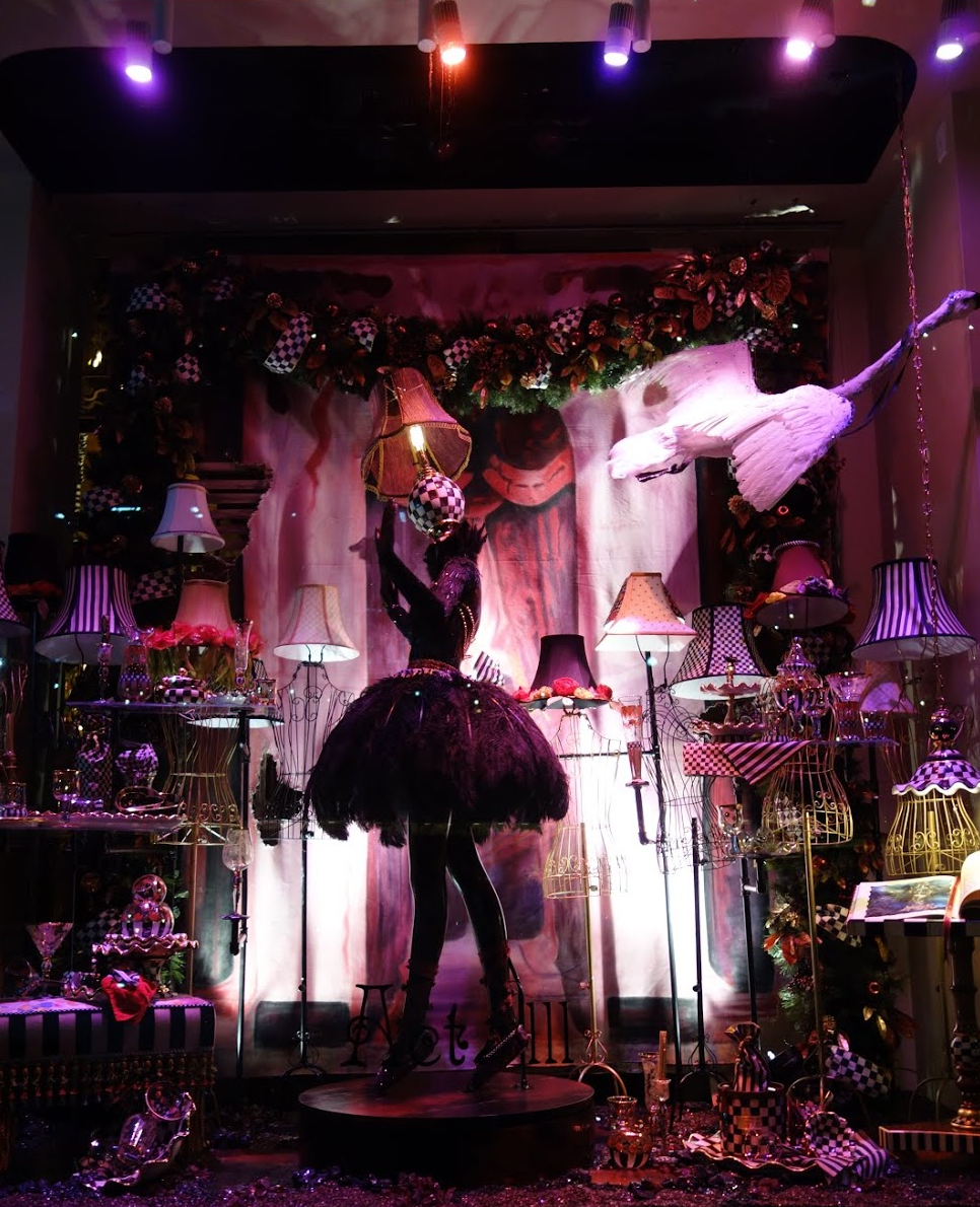 McKenzie Childs, in a similar feel to Kate Spade, has rotating mannequins with lamps for heads.