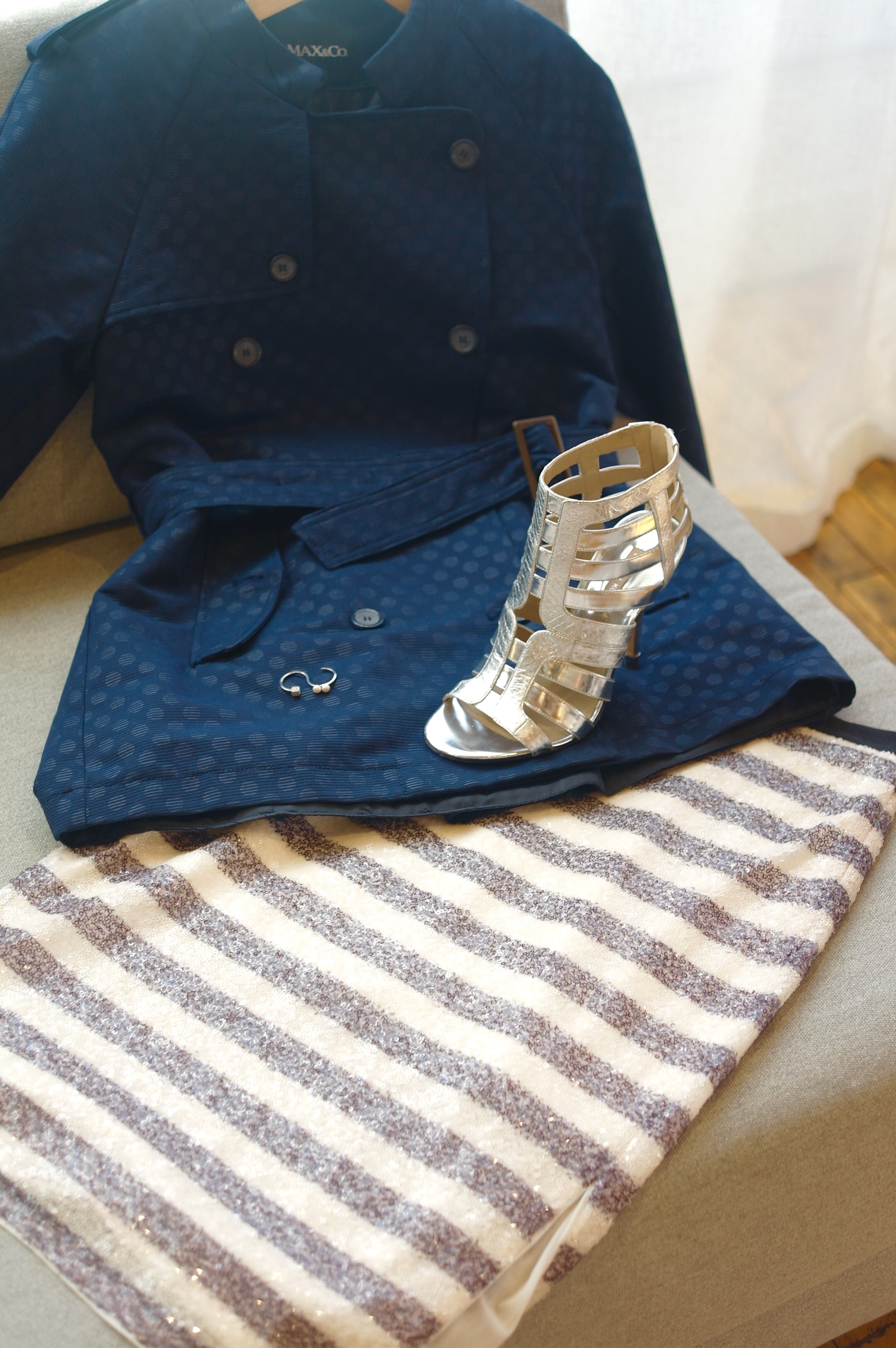I dug this striped sparkly pencil skirt. For the day, I added the Navy spotted belted jacket. To funk it up for evening: a silver strappy heel with a sparkly S ring. Ships Ahoy, Fashion Mateys!