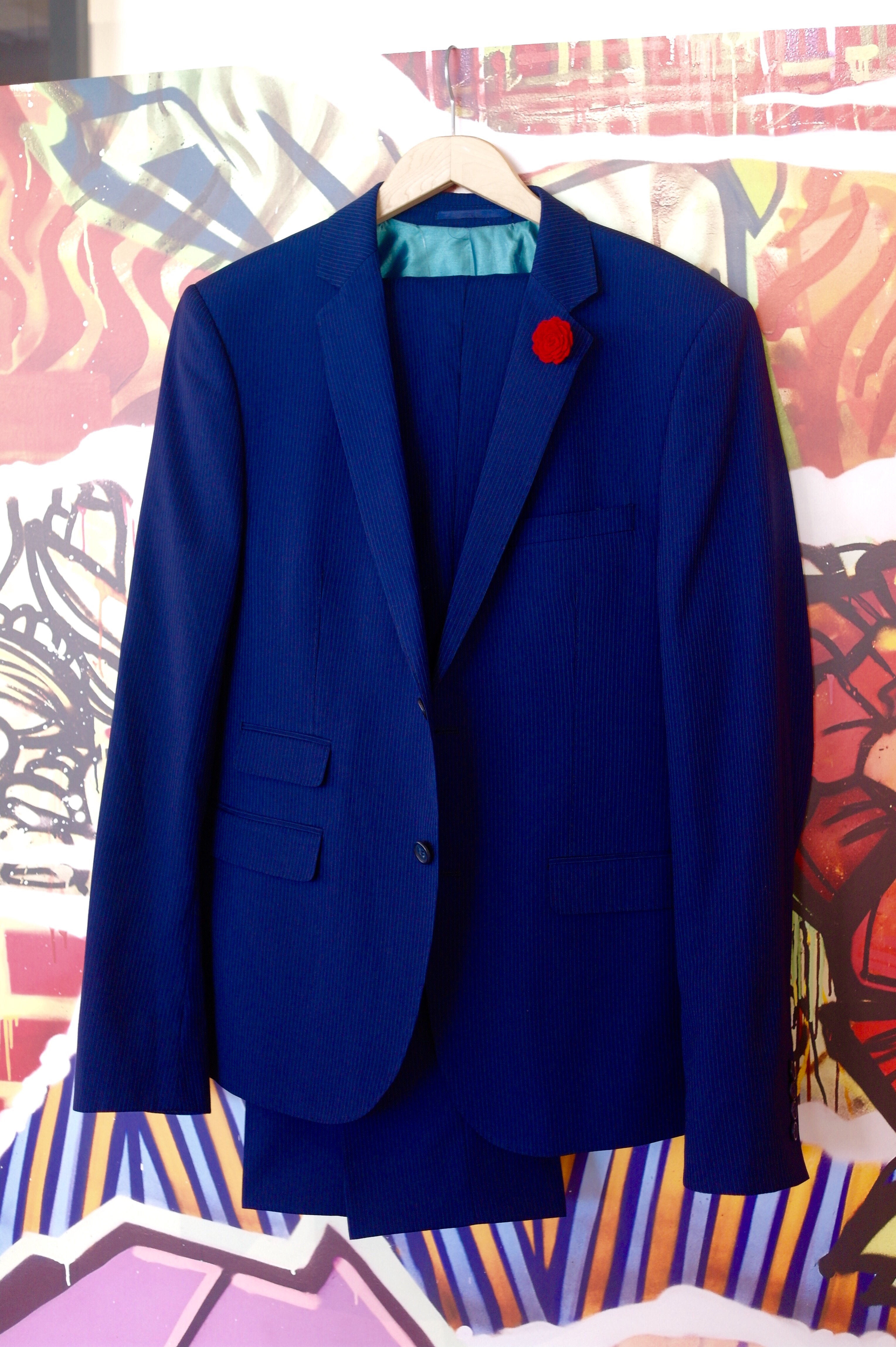 A classic navy suit with a faux red carnation. Great look for the ‘first interview’ or  ‘meeting-the-parents’.
