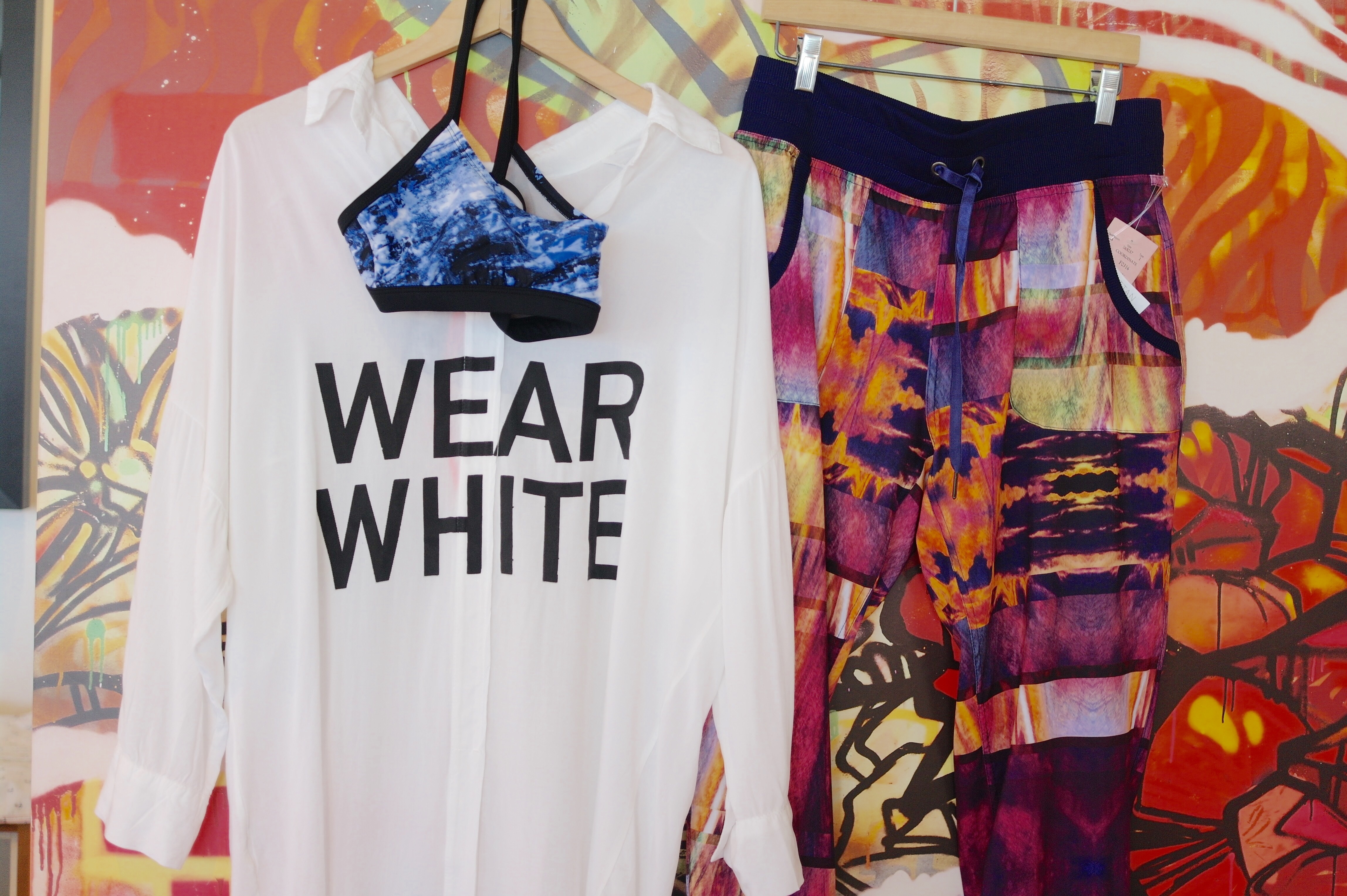 Keeping it casually cool after a workout. Adore these loose multi-colour light-weight ¾ harem pants with colourful sports bra & over-size top. Looking on point après sweat town!