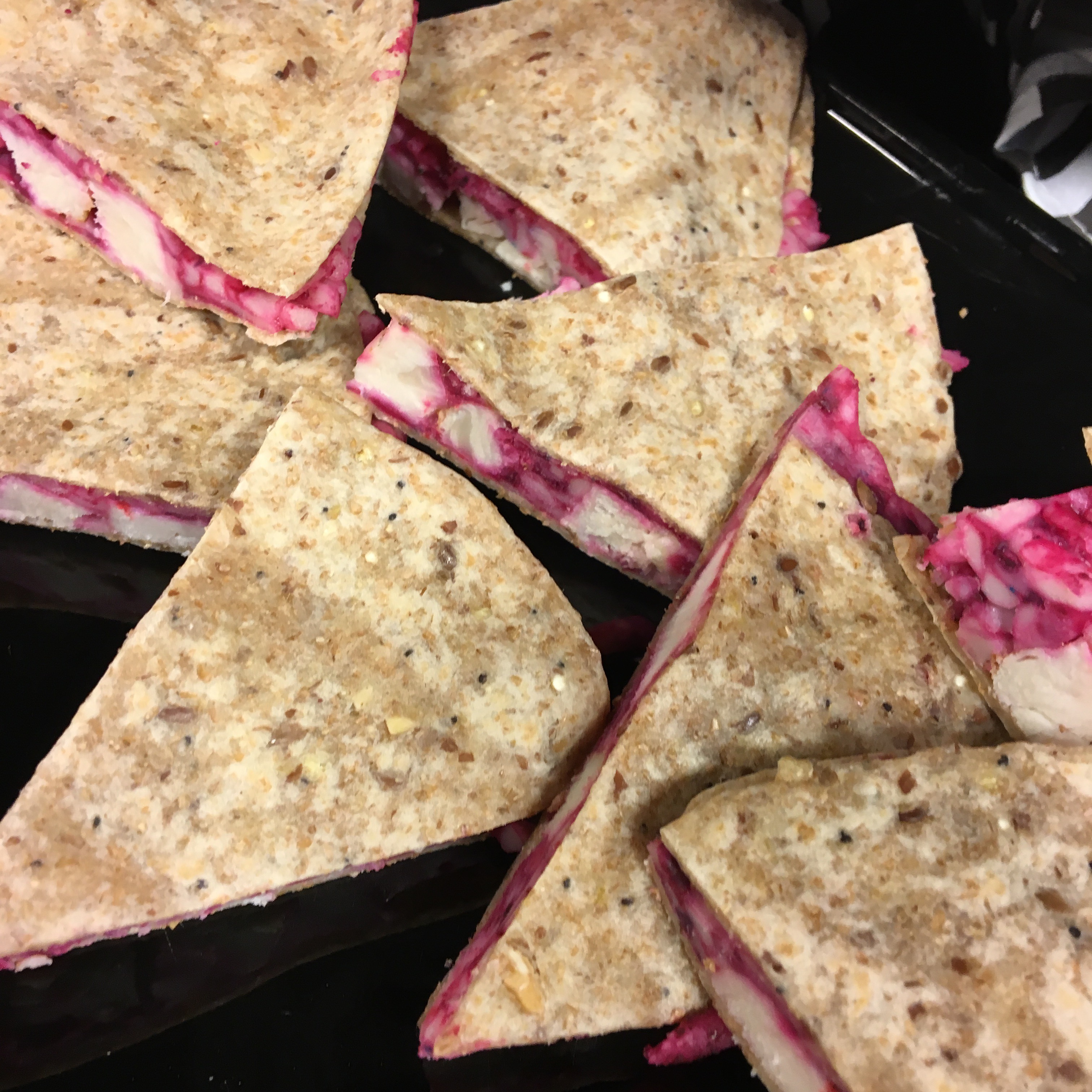 So to help feed and water your guests, I’ve dreamed up a few original recipes, like these easy top, fold and flip, Gruesome Quesadillas with Beet Dyed Mozzarella,