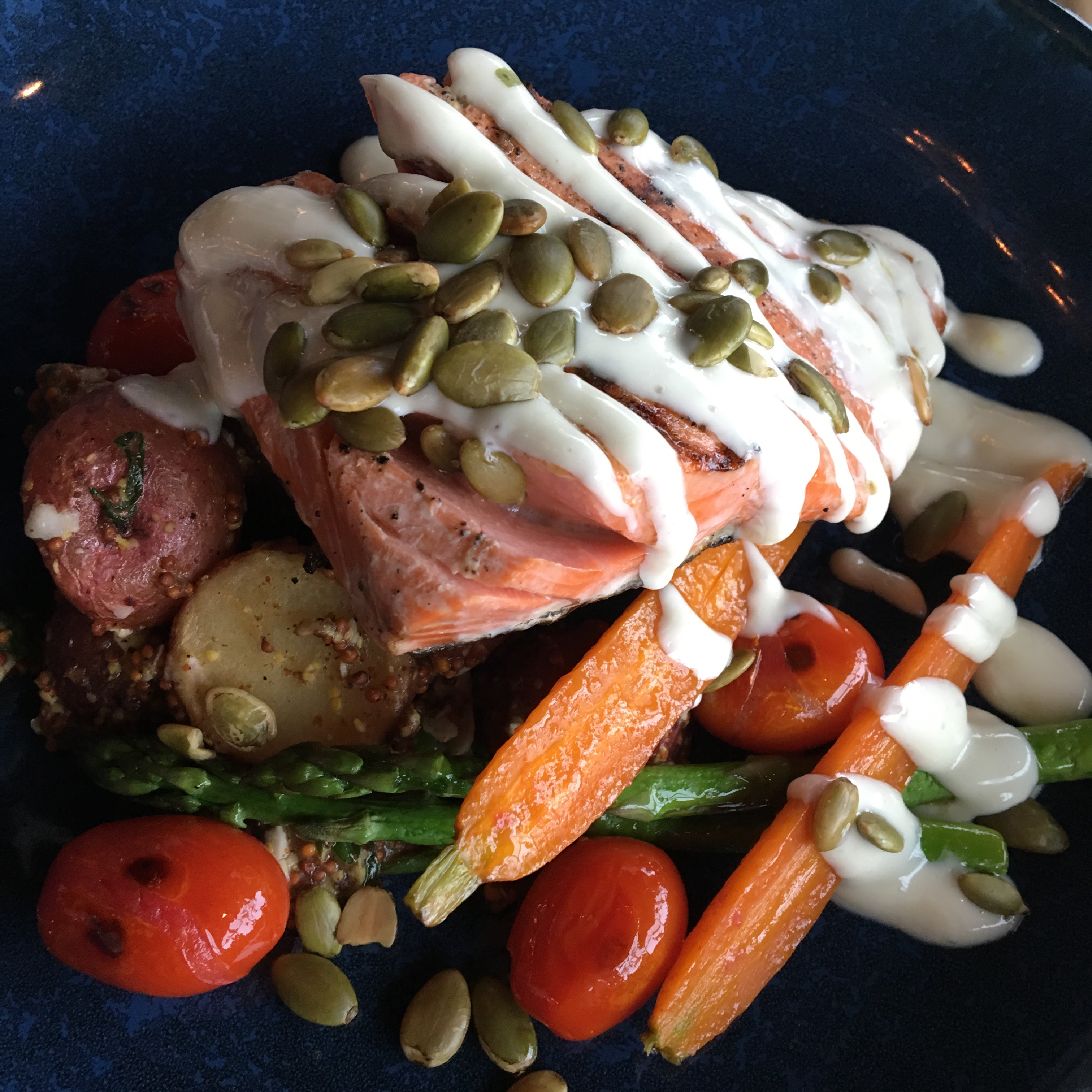 Line caught Pacific sockeye, warm potato salad, grape tomato, tarragon, lemon aioli, toasted pumpkin seeds.
