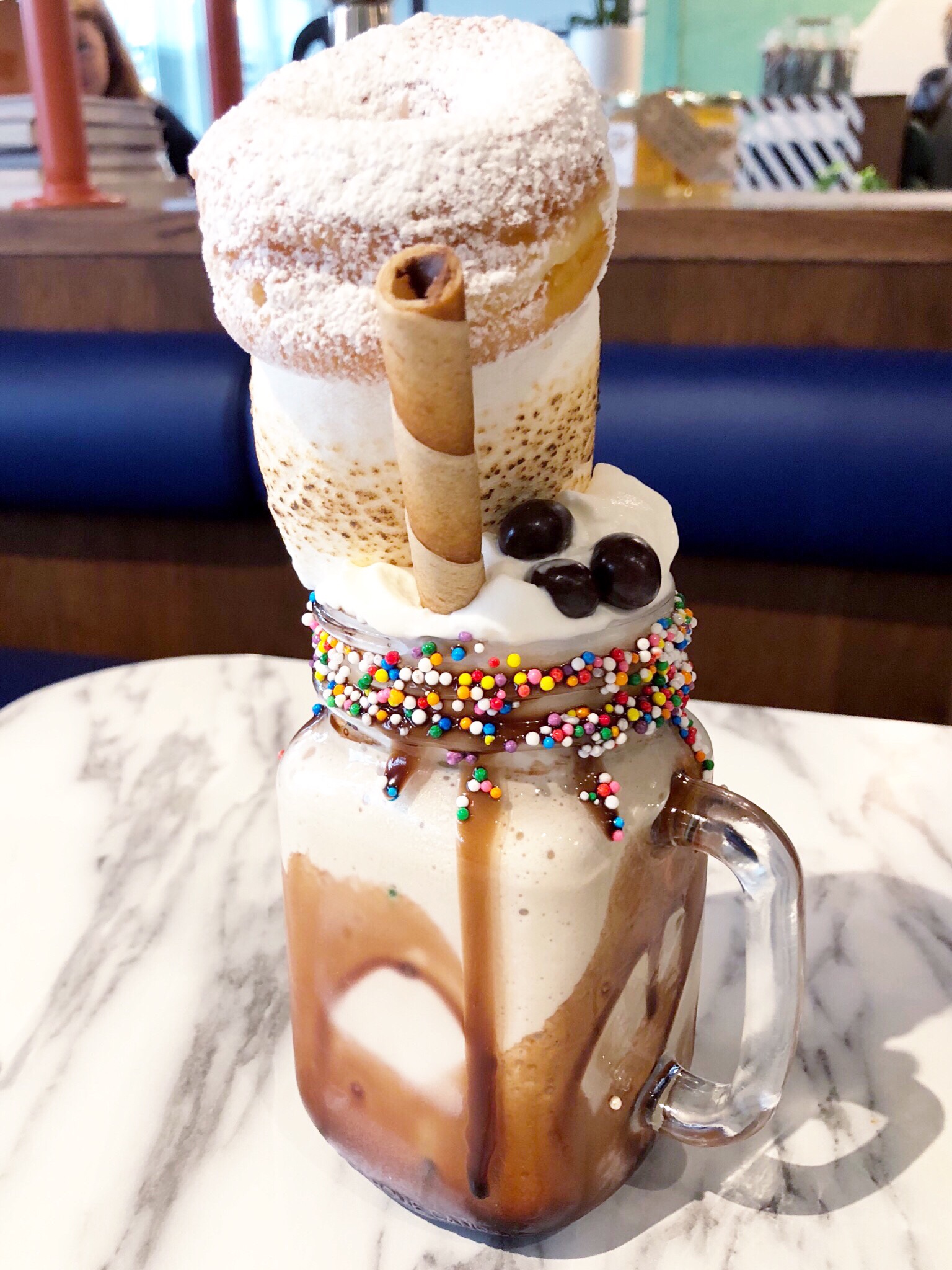 Topped with a powdered doughnut, a toasted marshmallow, a cookie, adorned with chocolate covered espresso beans and accessorized with sprinkles; this ‘breakfast’ was was off to a perfect start!