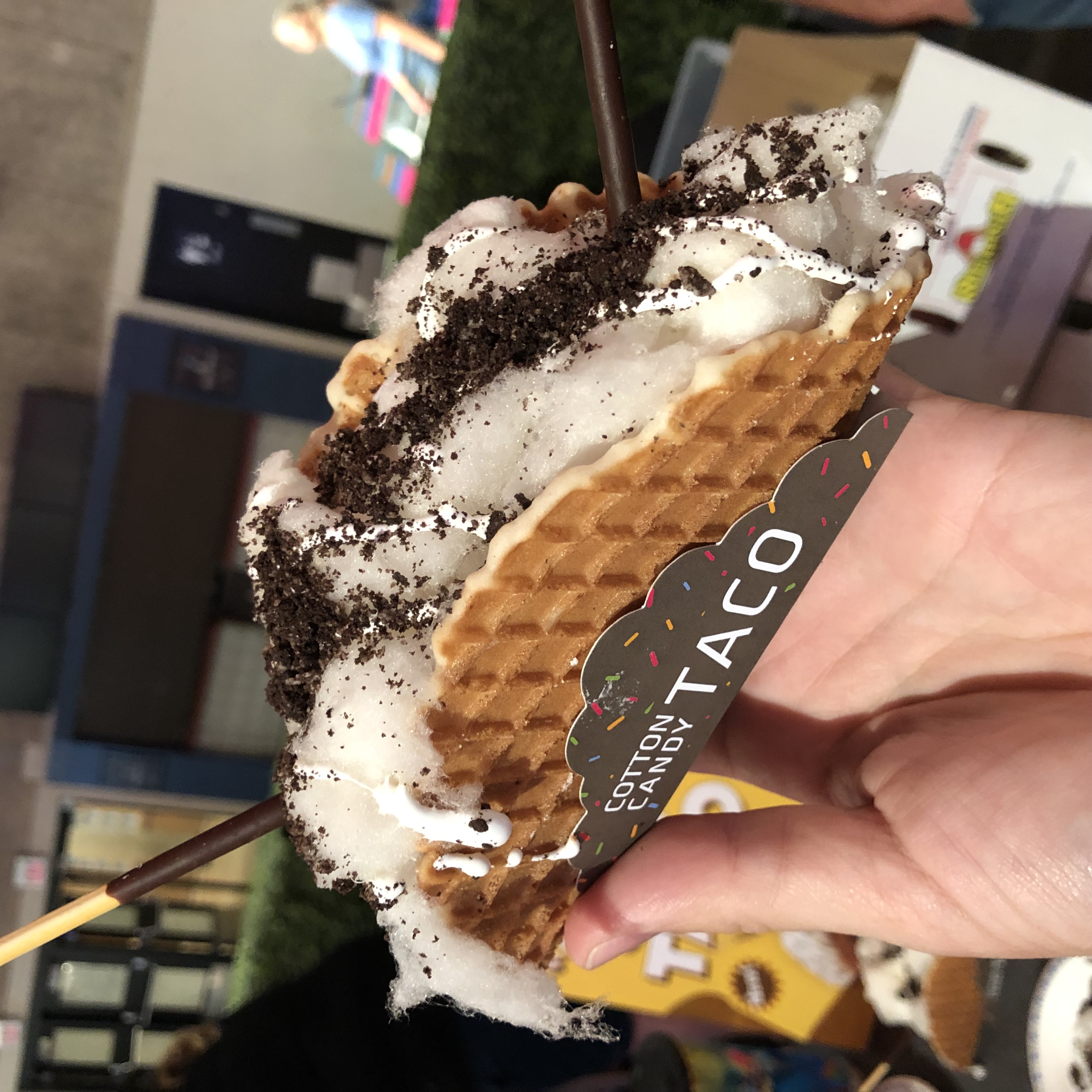 A fresh made waffle cone taco, stuffed with Maple Cotton Candy drizzled with Marshmallow and Chocolate Sauce, sprinkled with Oreo Cookie and topped with Pokey Sticks.