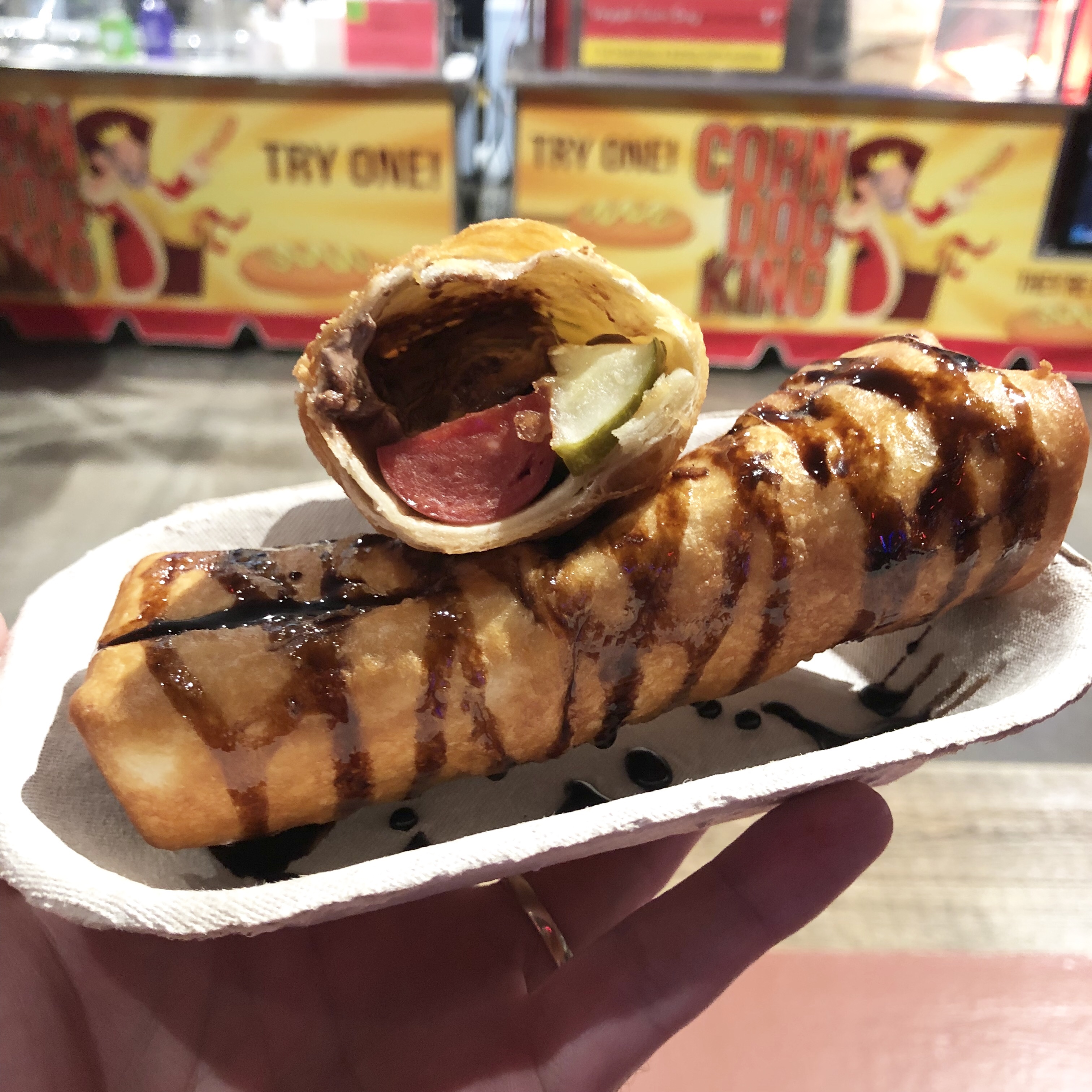 A rolled Tortilla stuffed with a Hotdog, Pickle Spear and a Snickers Bar, deep fried and drizzled in Chocolate.