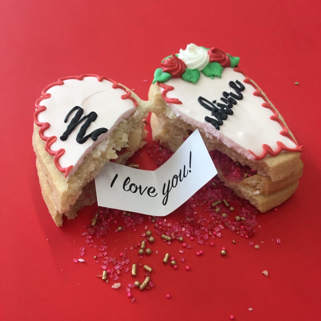A personalized conversation heart box cookie with a note you’ve created inside!